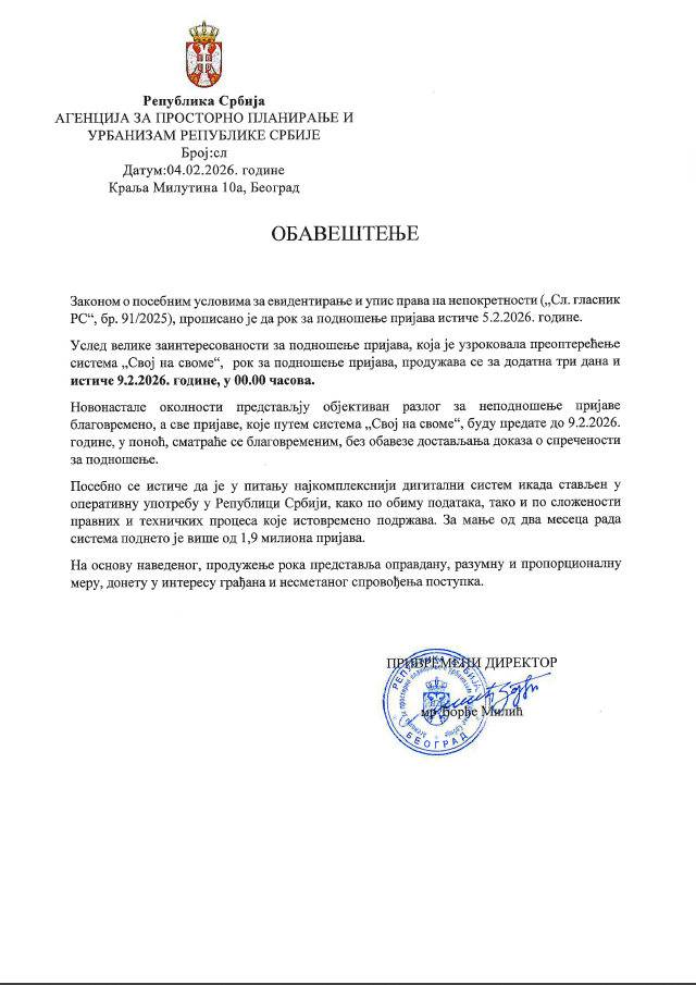 Рок за подношење пријава за упис објеката до 9. фебруара